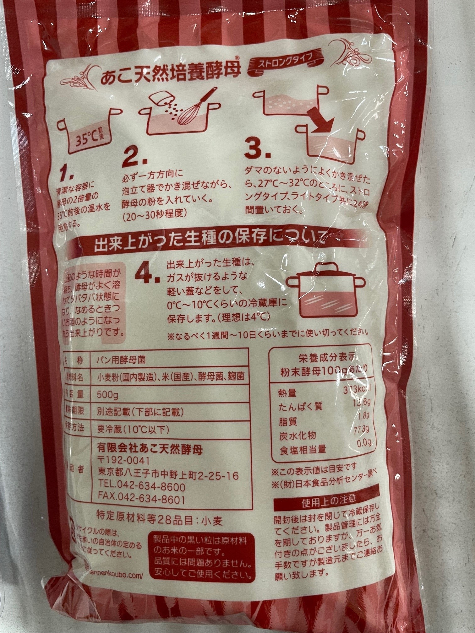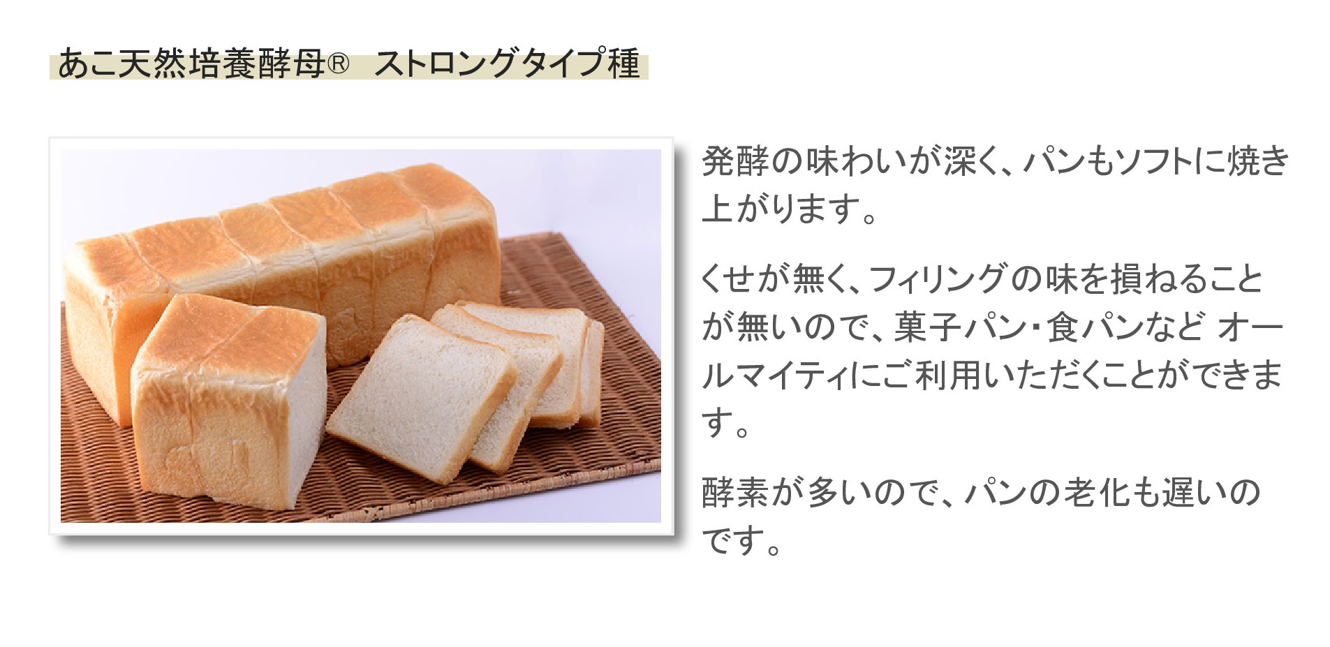 安定した発酵力と、雑味のないすっきりとした味わいで、今までの天然酵母のイメージ(固い、すっぱい、クセがある)とは違ったふっくらとしたやわらかい、毎日食べても飽きのこないパンを作ることができます。100%穀物と水だけで培養し、添加物等は一切使用していないため安心してご使用いただけます。 【ストロングタイプの特長】 発酵の味わいが深く、ソフトなパンに焼き上がります。また、酵素が多いので、パンの老化を遅らせることができます。くせが無く、フィリングの味を損ねることが無いので、菓子パン・食パンなど、オールマイティにご利用いただけます。 ※商品パッケージや仕様は予告なく変更になる場合がございます。食品表示情報につきましては、お手元に届きました商品の食品表示を必ずご確認いただきますようお願いします。