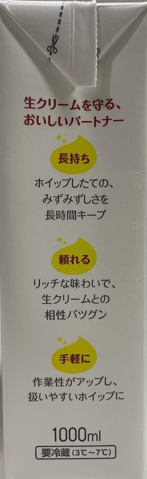①ホイップしたての、みずみずしさが持続。・・・ショーケースの光などによる風味劣化を防ぎ、ホイップの品質を長時間持続します。生クリーム本来のおいしさを守ります。