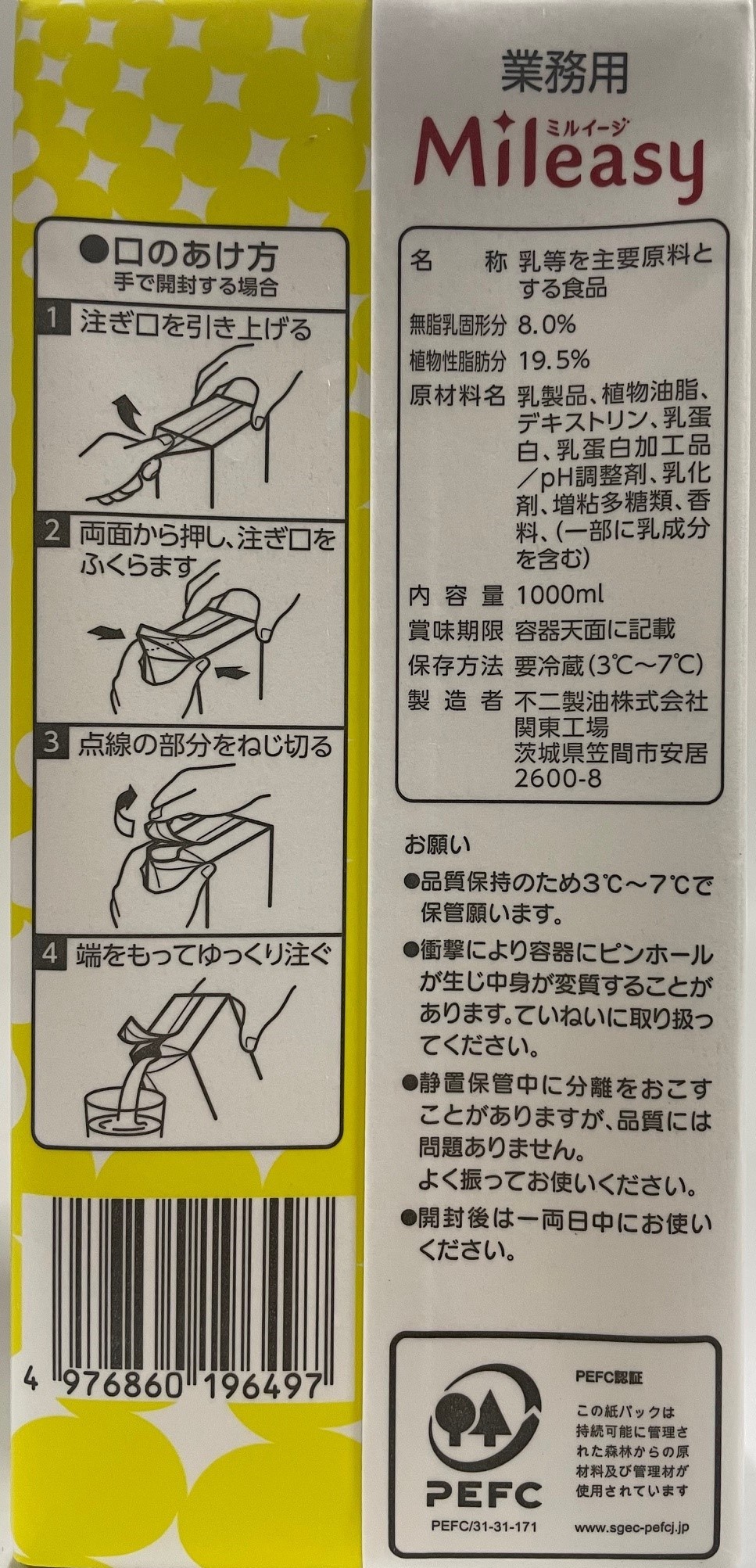 生クリームの作り方や泡立て方でお悩みの方、なるべく失敗しない方法をお探しの方に、不二製油のミルイージをご紹介します。混ぜるだけで簡単に作業性アップを実現。泡立てのコツを掴めなくても、プロ級の仕上がりに。おいしさが長持ちするのが特徴です。生クリームに対し、30%ブレンドを推奨いたします。