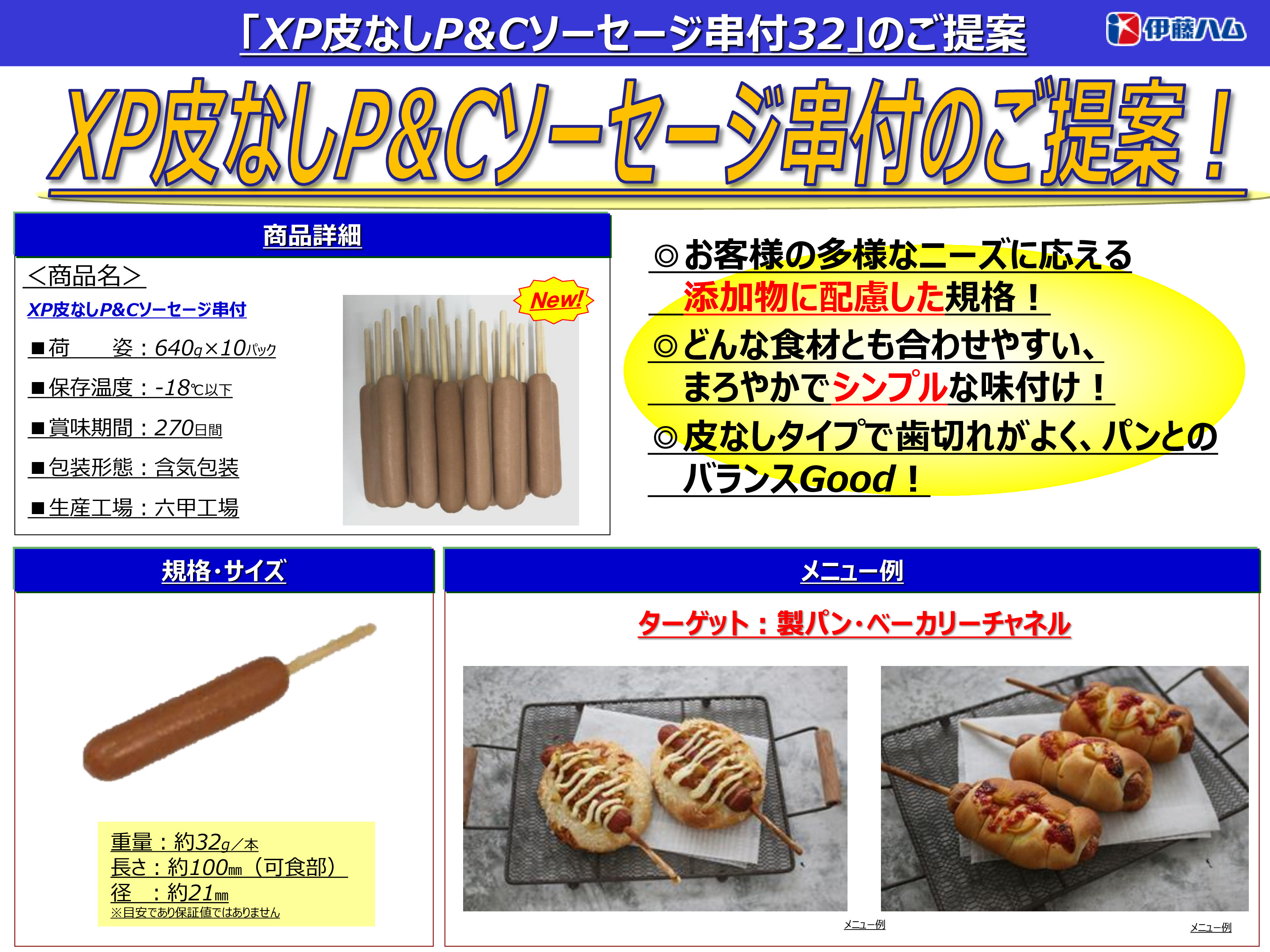どんな食材とも合わせやすい、まろやかでシンプルな味付け。皮なしタイプで歯切れがよく、パンとのバランスGood!
