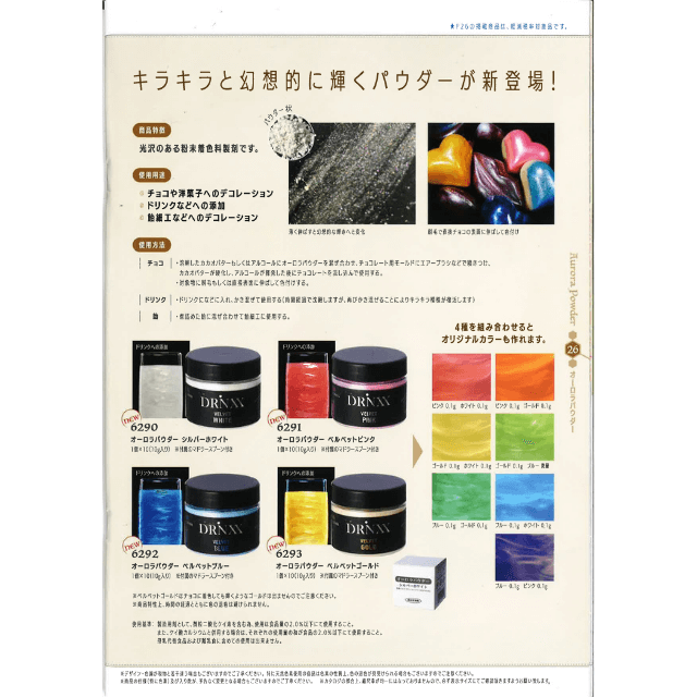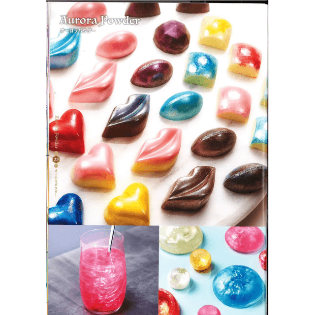 ・溶解したカカオバターもしくはアルコールにオーロラパウダーを混ぜ合わせ、チョコレート用モールドに エアーブラシなどでふきつけ、カカオバターが硬化し、アルコールが揮発した後にチョコレートを流し込んで使用する。