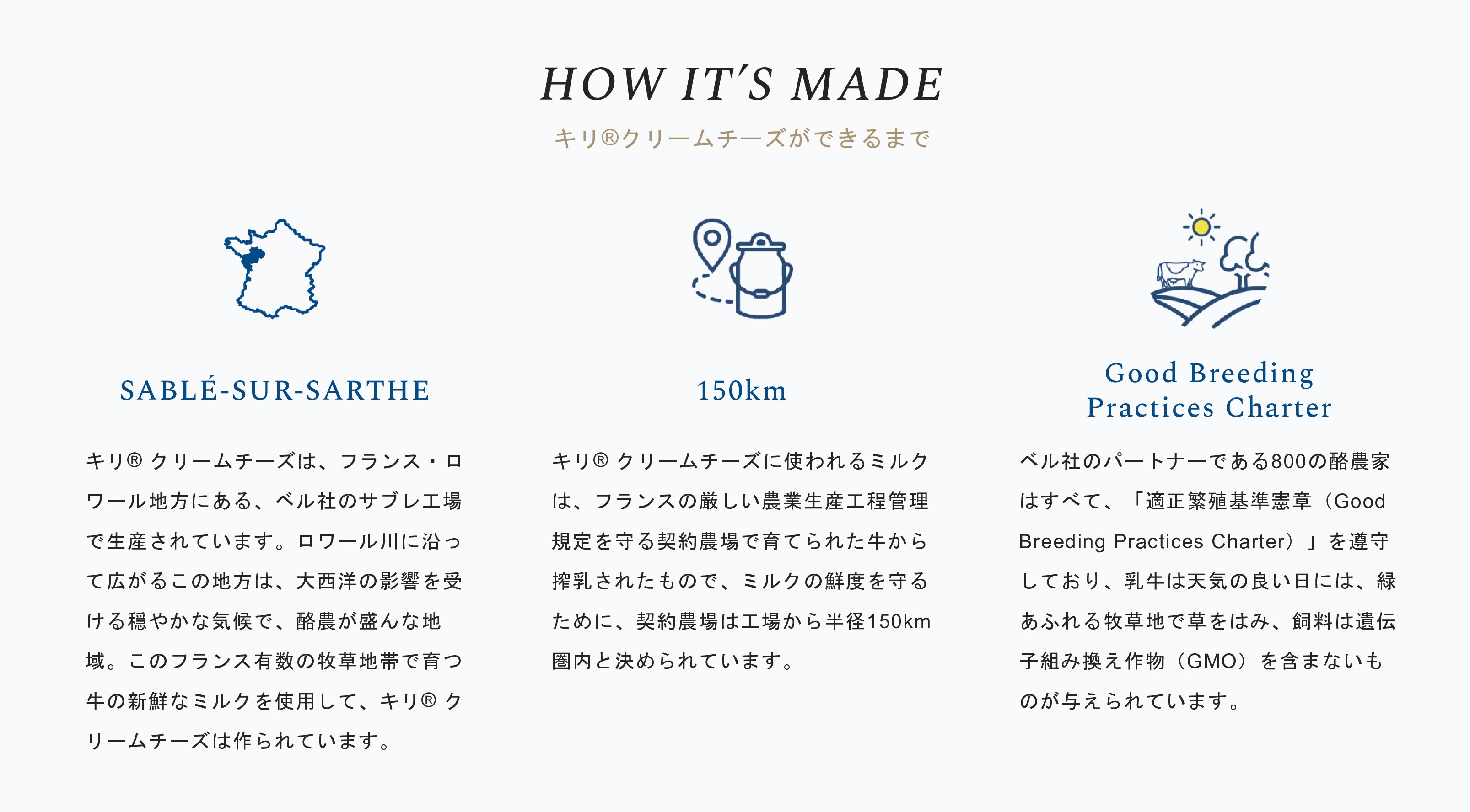 キリのクリームチーズは自然豊かなフランスの牧場で大切に育てられた牛からとれた新鮮なミルクと生クリームで作られています。