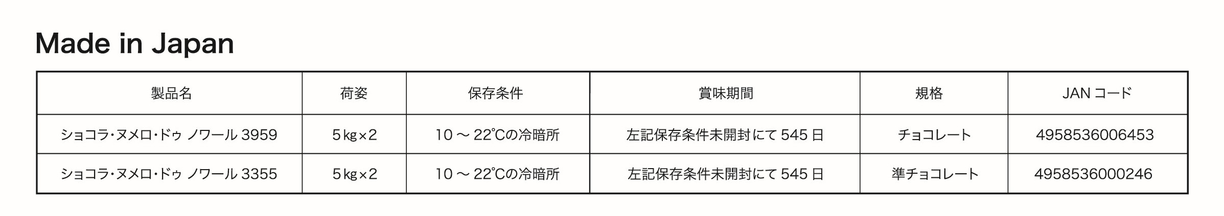 | 素材 | 規格:チョコレート 「Special Mass」の効果により、味質はカカオ分56~59%のチョコレート感を実現 カカオ分:39% カカオマス:33.8%(incl. Special Mass:29.8%) 植物油脂:16.9%(Essential Butter) 味質としてのカカオ感:59%相当(当社評価による) ※ベネズエラ産カカオ原料を中心に、数種類のカカオマスをブレンド。 |
