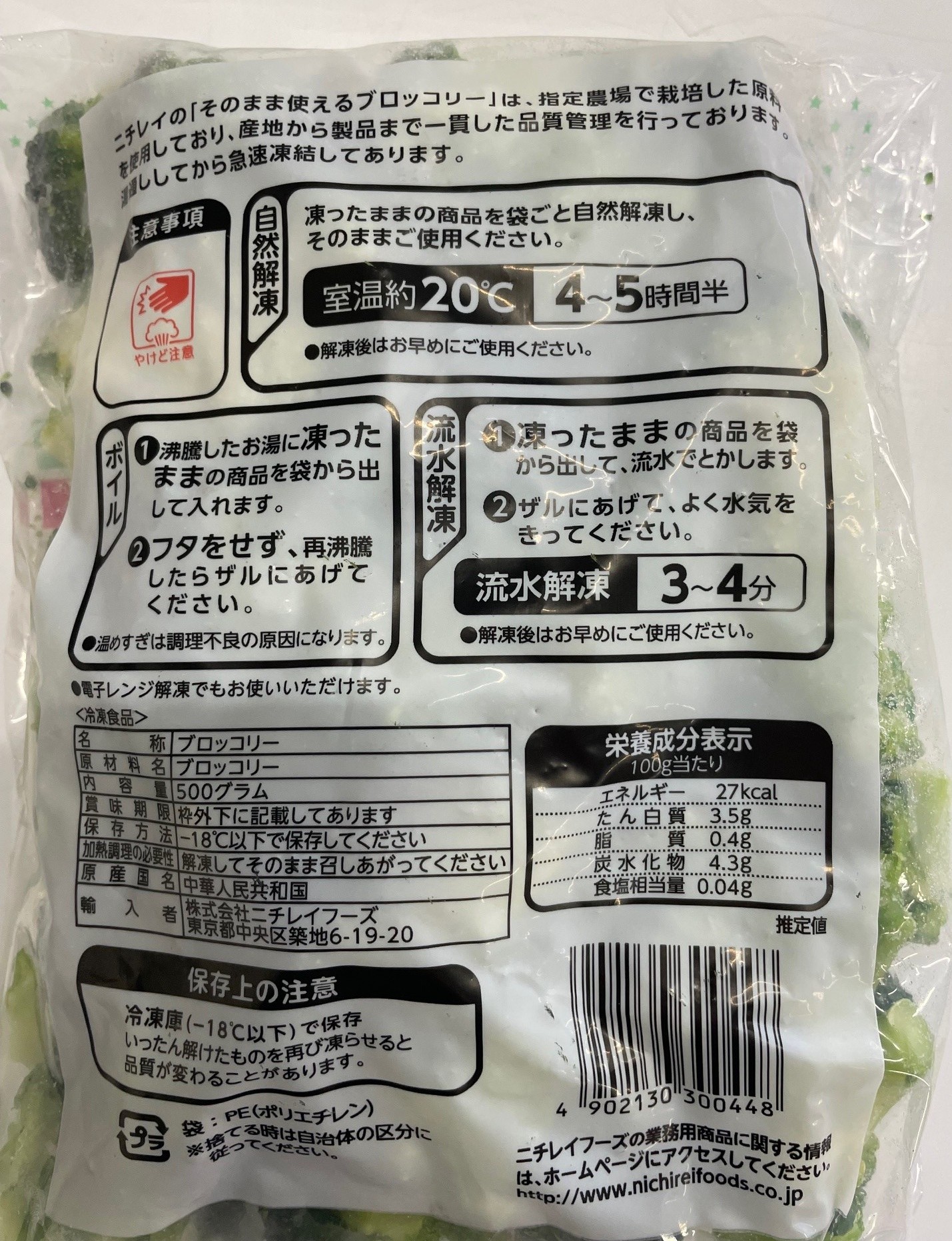 ニチレイの「そのまま使えるブロッコリー」は指定農場で栽培した原料を使用しており、産地から製品まで一貫した品質管理を行っております。湯通ししてから急速凍結してあります。