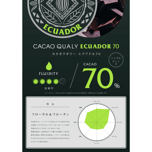 代表的なフレーバービーンであるエクアドル産カカオ豆を使用しています。エクアドル70(シングルビーン)