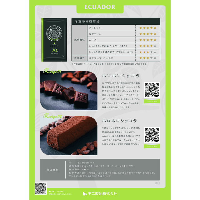 代表的なフレーバービーンであるエクアドル産カカオ豆を使用しています。エクアドルらしいフローラル・フルーティーな香りを追求したシングルビーンチョコレートです。農園を指定し、高品質なアリバ種のみを選定しています。(シングルビーンとはカカオマスに使用するカカオ豆の産地が単一産地であることを意味します)※ サステナブル・オリジン適用