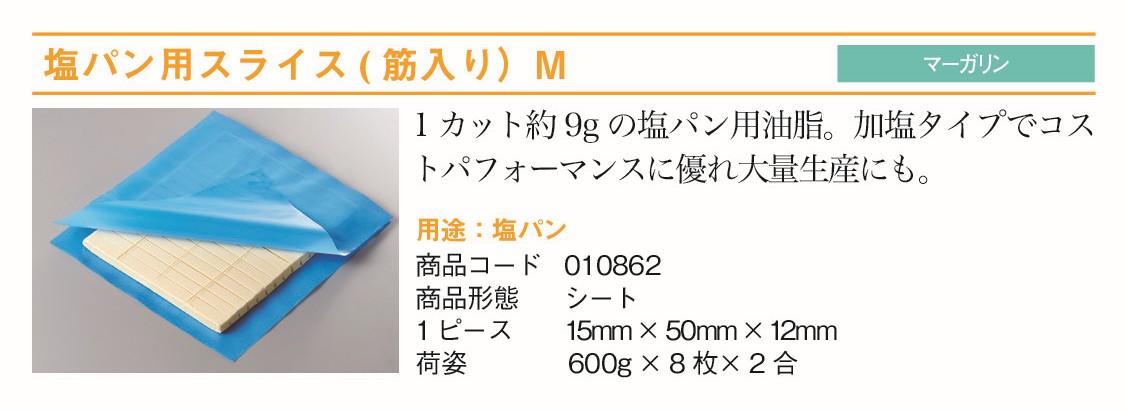 リボン食品 塩パン用スライス(筋入り)M 600gは、塩パン用途に特化して開発されたシート状マーガリンです。筋入り加工により1カット約9gに均一に切り分けやすく、包み作業の効率が大幅に向上します。加塩タイプでクセのないすっきりとした風味が、焼き上がりの塩パンに深みのある味わいをプラス。業務用600g入りの大容量で、ベーカリーや飲食店での毎日の大量使用にも安心して対応できます。